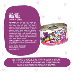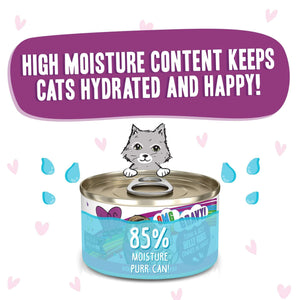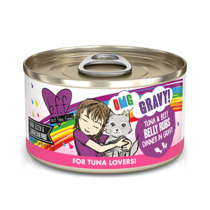 Once your kitty gets a taste of BFF’s OMG Belly Rubs! Tuna & Beef Flavor Wet Canned Cat Food, she’ll be purring for more! This complete meal is crafted with a delectable tuna broth, followed by real minced tuna and beef, plus added vitamins and minerals. And since your paw-tner deserves nothing but the best, this recipe is completely free of grains, gluten, carrageenan, wheat, soy, MSG and artificial flavors and colors. You’ll also be happy to know that all the tuna in BFF recipes is line-caught and certified dolphin and sea turtle safe and sourced using modern fishing practices. Your feline friend is sure to lick her dish clean once she gets a taste of this delectable wet cat food!