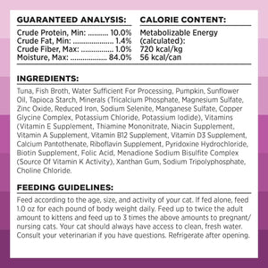 Tuna, Fish Broth, Water Sufficient For Processing, Pumpkin, Sunflower Oil, Tapioca Starch, Minerals (Tricalcium Phosphate, Magnesium Sulfate, Zinc Oxide, Reduced Iron, Sodium Selenite, Manganese Sulfate, Copper Glycine Complex, Potassium Chloride, Potassium Iodide), Vitamins (Vitamin E Supplement, Thiamine Mononitrate, Niacin Supplement, Vitamin A Supplement, Vitamin B12 Supplement, Vitamin D3 Supplement, Calcium Pantothenate, Riboflavin Supplement, Pyridoxine Hydrochloride, Biotin Supplement, Folic Acid, Menadione Sodium Bisulfite Complex (Source Of Vitamin K Activity), Xanthan Gum, Sodium Tripolyphosphate, Choline Chloride