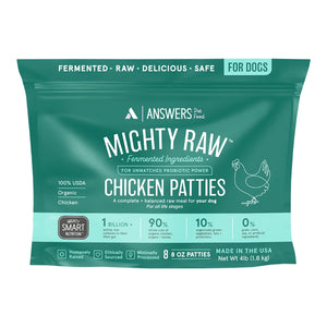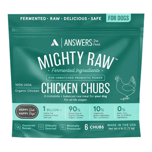At the heart of your dog's vitality is a healthy gut, and our Mighty Raw™ recipe is crafted to deliver exactly that! With a powerful blend of fermented and whole food ingredients, our one-of-a-kind recipe is full of probiotic power to support gut health and boost nutrient absorption. Our Mighty Raw Chicken Recipe is packed with 90% premium animal protein, featuring chicken, chicken liver, chicken heart, and ground chicken bone as the first four ingredients. This powerful lineup, combined with fermented vegetables, fermented raw whey, and other natural, wholefood ingredients, provides all the nutrition your dog needs for a strong body, healthy gut, and happy life.