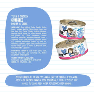 Turn meal time into yum time for your best feline friend with the BFF Tuna & Chicken Chuckles with Tuna & Chicken in Aspic Canned Cat Food. Made with wild-caught tuna and chicken as the top ingredients, plus essential vitamins, taurine, amino acids and minerals, it provides a deliciously balanced, carnivore-based diet for all kitties. Since it’s packed with broth, it’s a great way to add much-needed hydration to keep your little hunter healthy. Plus, it’s made with sustainably sourced ingredients in state of the art food facilities with nothing artificial.