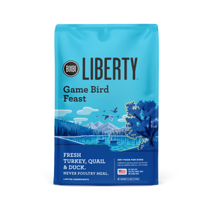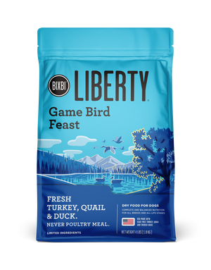 BIXBI Liberty Dry Food for Dogs Game Bird Feast Recipe is packed with cage-free turkey, quail and duck and combined with nutritious whole food ingredients. We cook each recipe at low temperatures to help retain nutrients and flavor. With healthy grains like oats and sorghum, Liberty is responsibly sourced and made in the USA. All recipes are tested for digestibility ensuring your pup gets the most nutrition out of their bowl.