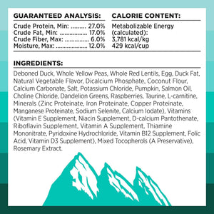 Duck, Lentils, Whole Yellow Peas, Dried Yeast, Sunflower Oil, Dried Egg Product, Natural Flavor, Garbanzo Beans, Dicalcium Phosphate, Coconut Flour, Calcium Carbonate, Salt, Freeze- Dried Duck, Vitamins (vitamin E supplement, niacin supplement, d-calcium pantothenate, riboflavin supplement, vitamin A supplement, thiamine mononitrate, pyridoxine hydrochloride, vitamin B12 supplement, folic acid, vitamin D3 supplement), Minerals (zinc proteinate, iron proteinate, copper proteinate, manganese proteinate, sodium selenite, calcium iodate), Inulin, Salmon Oil, Choline Chloride, Taurine, L-Carnitine, Mixed Tocopherols (a preservative), Rosemary Extract