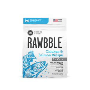 A raw diet for your cat doesn’t need to be hard! BIXBI Rawbble Freeze-Dried Food for Cats Chicken & Salmon Recipe combines the whole-animal nutrients of raw food with the convenience of kibble. With 95% chicken, fish, and bone to give your cat a healthy source of protein, Rawbble uses freeze-dried technology to lock more naturally sourced essential nutrients into every bite. Complete and balanced to serve as a stand-alone food or as an irresistible topper or treat.