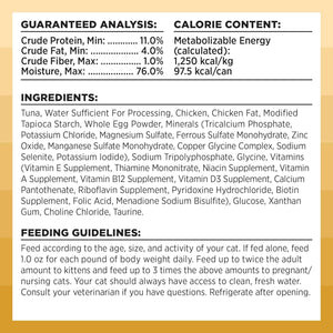 Tuna, Water Sufficient For Processing, Chicken, Chicken Fat, Modified Tapioca Starch, Whole Egg Powder, Minerals (Tricalcium Phosphate, Potassium Chloride, Magnesium Sulfate, Ferrous Sulfate Monohydrate, Zinc Oxide, Manganese Sulfate Monohydrate, Copper Glycine Complex, Sodium Selenite, Potassium Iodide), Sodium Tripolyphosphate, Glycine, Vitamins (Vitamin E Supplement, Thiamine Mononitrate, Niacin Supplement, Vitamin A Supplement, Vitamin B12 Supplement, Vitamin D3 Supplement, Calcium Pantothenate, Riboflavin Supplement, Pyridoxine Hydrochloride, Biotin Supplement, Folic Acid, Menadione Sodium Bisulfite), Glucose, Xanthan Gum, Choline Chloride, Taurine