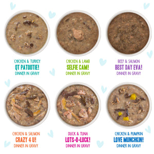 The B.F.F Rainbow Road 2.8 oz Variety Pack includes the following flavors: Duck & Tuna Lots-O-Luck!, Chicken & Salmon Crazy 4 U!, Chicken & Lamb Selfie Cam!, Chicken & Turkey QT Patootie!, Chicken & Pumpkin Love Munchkin! and Beef & Salmon Best Day Eva!