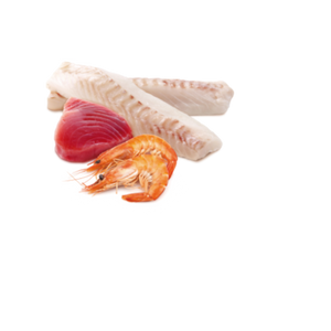 Tuna, cod, herring, sweet potatoes, shrimp, herring oil, fructooligosaccharide, calcium carbonate, potassium chloride, vitamin A supplement, vitamin D3 supplement, vitamin E supplement, menadione sodium bisulfite complex, choline chloride, zinc methionine hydroxy analogue chelate, manganese methionine hydroxy analogue chelate, ferrous glycine complex, copper methionine hydroxy analogue chelate, DL-methionine, taurine, L-Carnitine.