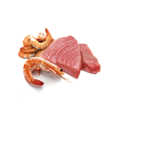 Tuna, cod, herring, sweet potatoes, shrimp, herring oil, fructooligosaccharide, calcium carbonate, potassium chloride, vitamin A supplement, vitamin D3 supplement, vitamin E supplement, menadione sodium bisulfite complex, choline chloride, zinc methionine hydroxy analogue chelate, manganese methionine hydroxy analogue chelate, ferrous glycine complex, copper methionine hydroxy analogue chelate, DL-methionine, taurine, L-Carnitine.