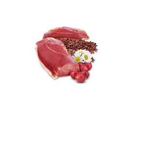 duck, herring, eggs, quinoa seed, herring oil, cranberry, chamomile, fructooligosaccharide, calcium sulfate dihydrate, calcium carbonate, potassium chloride, vitamin A supplement, vitamin D3 supplement, vitamin E supplement, choline chloride, zinc methionine hydroxy analogue chelate, manganese methionine hydroxy analogue chelate, ferrous glycine, copper methionine hydroxy analogue chelate, DL-methionine, taurine, L-Carnitine.
