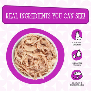 Chicken, Chicken Broth, Locust Bean Gum, Sunflower Seed Oil, Guar Gum, Xanthan Gum, Tricalcium Phosphate, Calcium Lactate, Potassium Chloride, Choline Chloride, Zinc Sulfate, Vitamin E Supplement, Magnesium Sulfate, Calcium Pantothenate, Nicotinic Acid (Vitamin B3), Thiamin Mononitrate (Vitamin B1), Manganese Proteinate, Vitamin A Supplement, Riboflavin Supplement (Vitamin B2), Ferrous Sulfate, Copper Sulfate, Pyridoxine Hydrochloride (Vitamin B6), Folic Acid, Vitamin D3 Supplement, Potassium Iodide, Sodium Selenite, Vitamin B12 Supplement