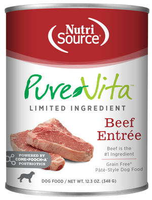 NutriSource PureVita Pate-Style dog food features meat rich, single source animal protein dense recipes.