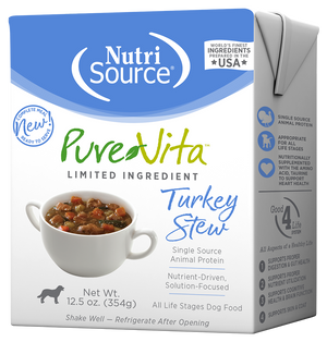 NutriSource PureVita Stews feature meat rich, single source animal protein dense recipes.