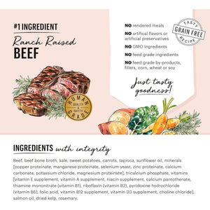 Beef, beef bone broth, kale, sweet potatoes, carrots, tapioca, sunflower oil, minerals [copper proteinate, manganese proteinate, sodium selenite, zinc proteinate, calcium carbonate, potassium chloride, magnesium proteinate], tricalcium phosphate, vitamins [vitamin E supplement, vitamin A supplement, niacin supplement, calcium pantothenate, thiamine mononitrate (vitamin B1), riboflavin (vitamin B2), pyridoxine hydrochloride (vitamin B6), folic acid, vitamin B12 supplement, vitamin D3 supplement, choline chloride], salmon oil, dried kelp, rosemary.