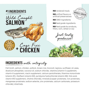 Fish broth, salmon, chicken, pollock, brown rice, broccoli, tapioca, sunflower oil, peas, dicalcium phosphate, coconut oil, salt, vitamins [vitamin E supplement, vitamin A supplement, niacin supplement, calcium pantothenate, thiamine mononitrate (vitamin B1), riboflavin (vitamin B2), pyridoxine hydrochloride (vitamin B6), folic acid, vitamin B12 supplement, choline chloride], minerals [copper proteinate, iron proteinate, manganese proteinate, sodium selenite, zinc proteinate, calcium carbonate, potassium chloride], dried kelp.​