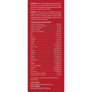 Fresh Chicken, Chicken Liver, eggs, organic sprouted barley seed, salmon, sweet potato, whole brown rice, organic sprouted flaxseed, organic sprouted lentils, organic sprouted peas, potato starch, apples, carrots, sea salt, kelp. …Nothing Else