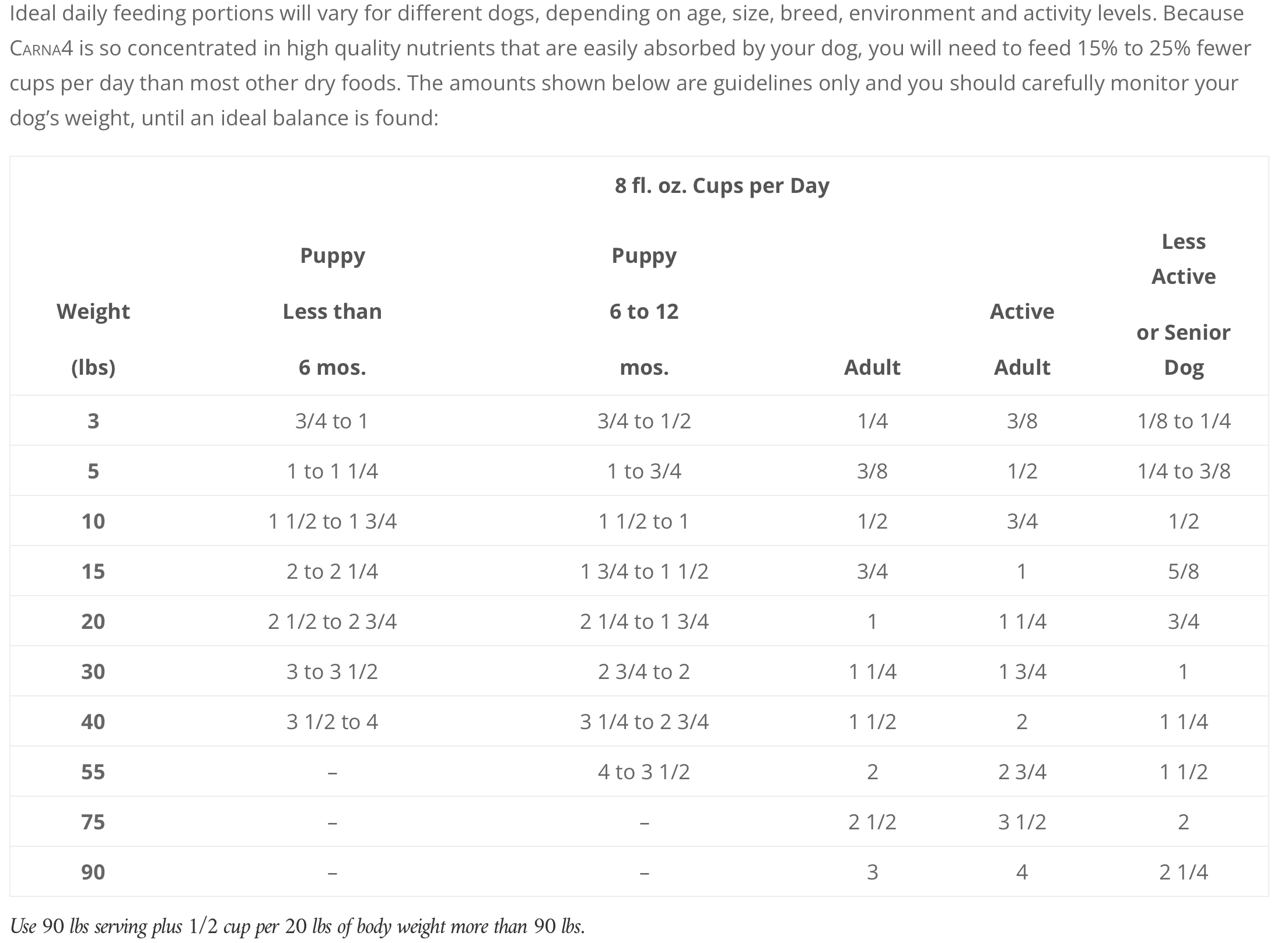For example, just two 8 fl.oz cups of Carna4's Chicken Recipe is 1000 calories. This is generally enough food for a 55-60 pound dog for an entire day. In comparison, two 8 fl.oz cups of Hill's Science Diet Adult Chicken and Barley Recipe is 726 calories and the guideline on the bag tells you to feed 3 and 2/3rds of a cup per day to a 60 pound dog. This means that when comparing feeding guidelines, you would be feeding 46% less of Carna4's Chicken Recipe compared to Hill's Science Diet Adult Chicken and Barley Recipe.