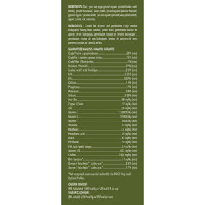 Duck, pork liver, eggs, ground organic sprouted barley seed, herring, ground fava beans, sweet potato, ground organic sprouted flaxseed, ground organic sprouted lentils, ground organic sprouted peas, potato starch, apples, carrots, sea salt, kelp.