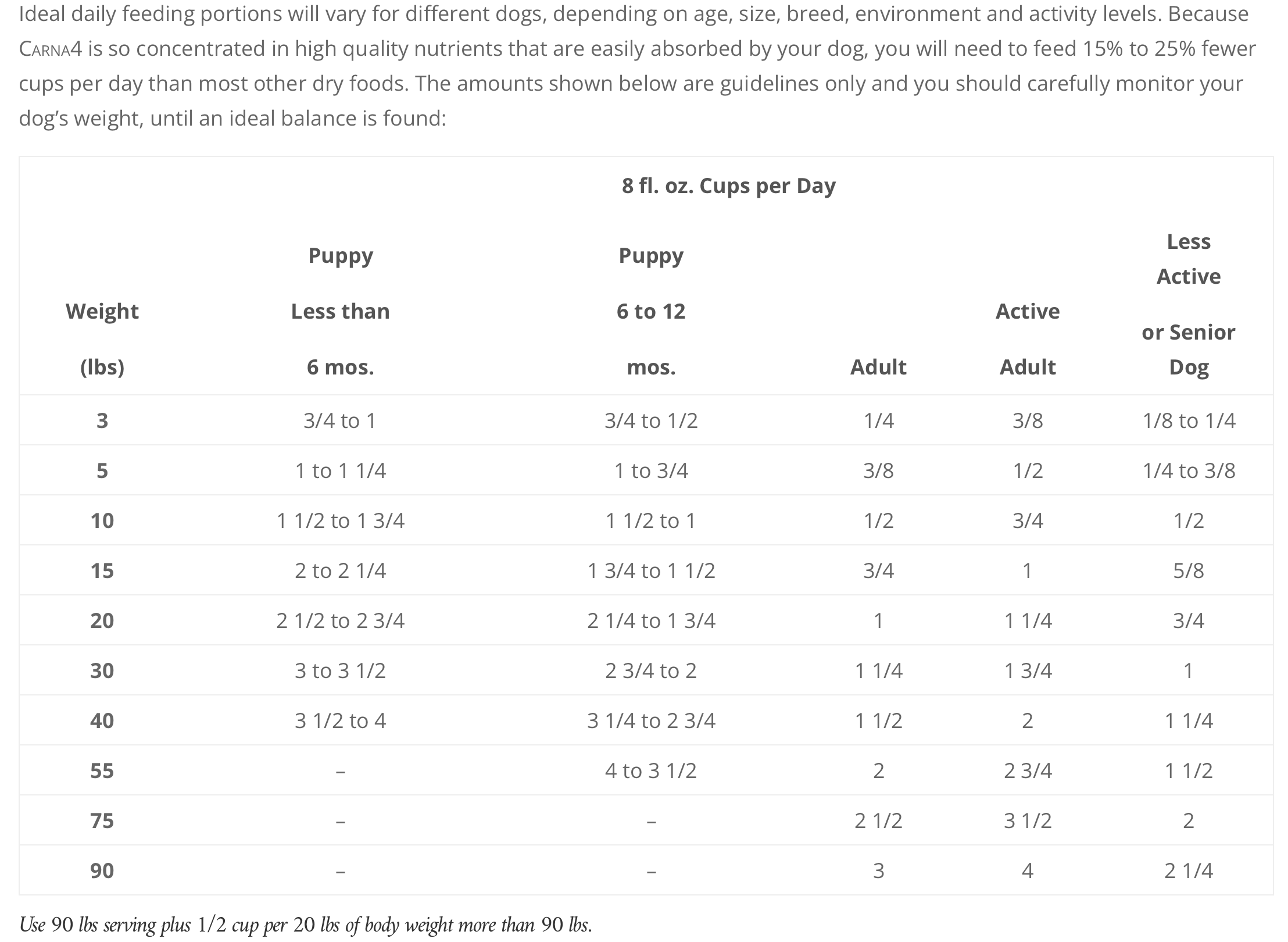 For example, just two 8 fl.oz cups of Carna4's Duck Recipe is 1050 calories. This is generally enough food for a 55-60 pound dog for an entire day. In comparison, two 8 fl.oz cups of Hill's Science Diet Adult Chicken and Barley Recipe is 726 calories and the guideline on the bag tells you to feed 3 and 2/3rds of a cup per day to a 60 pound dog. This means that when comparing feeding guidelines, you would be feeding 46% less of Carna4's Duck Recipe compared to Hill's Science Diet Adult Chicken and Barley Recipe.