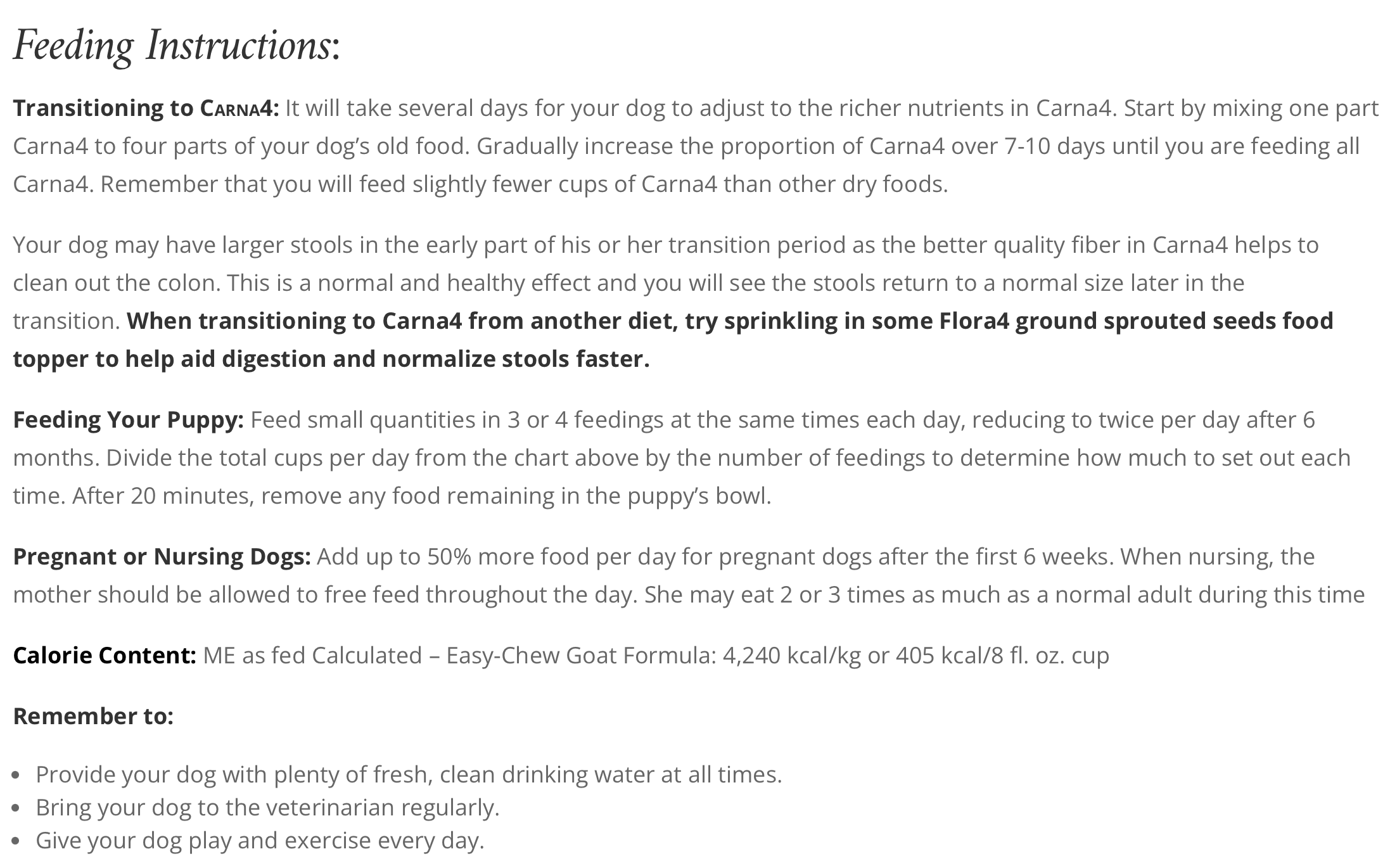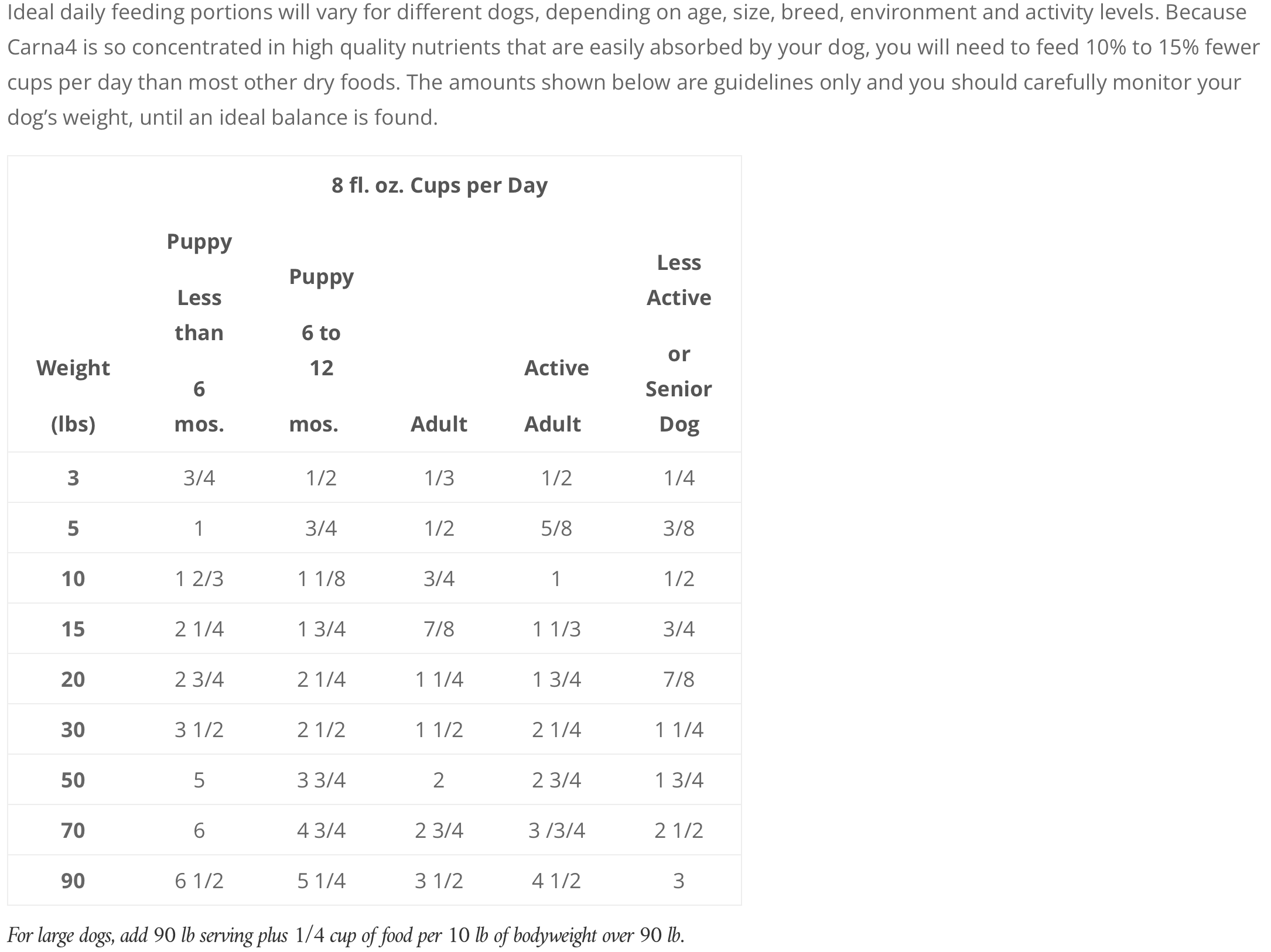 For example, just two and a quarter 8 fl.oz cups of Carna4's Goat Recipe is 906 calories. Because of its superior digestibility, this is generally enough food for a 50 pound dog for an entire day. In comparison, two and a quarter 8 fl.oz cups of Hill's Science Diet Adult Chicken and Barley Recipe is 821 calories and the guideline on the bag tells you to feed 3 and 1/3rds of a cup per day to a 50 pound dog. This means that when comparing feeding guidelines, you would be feeding 32% less of Carna4's Goat Recipe compared to Hill's Science Diet Adult Chicken and Barley Recipe.