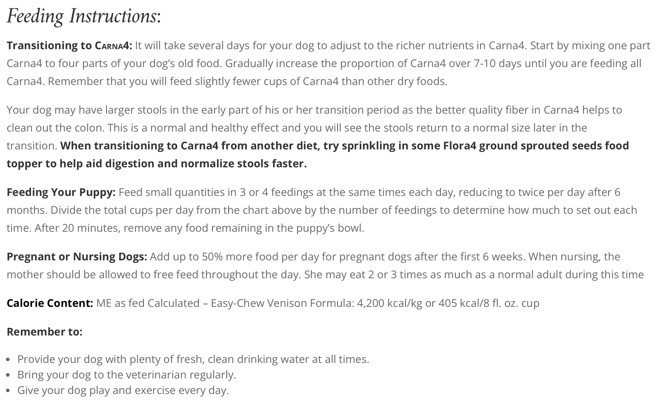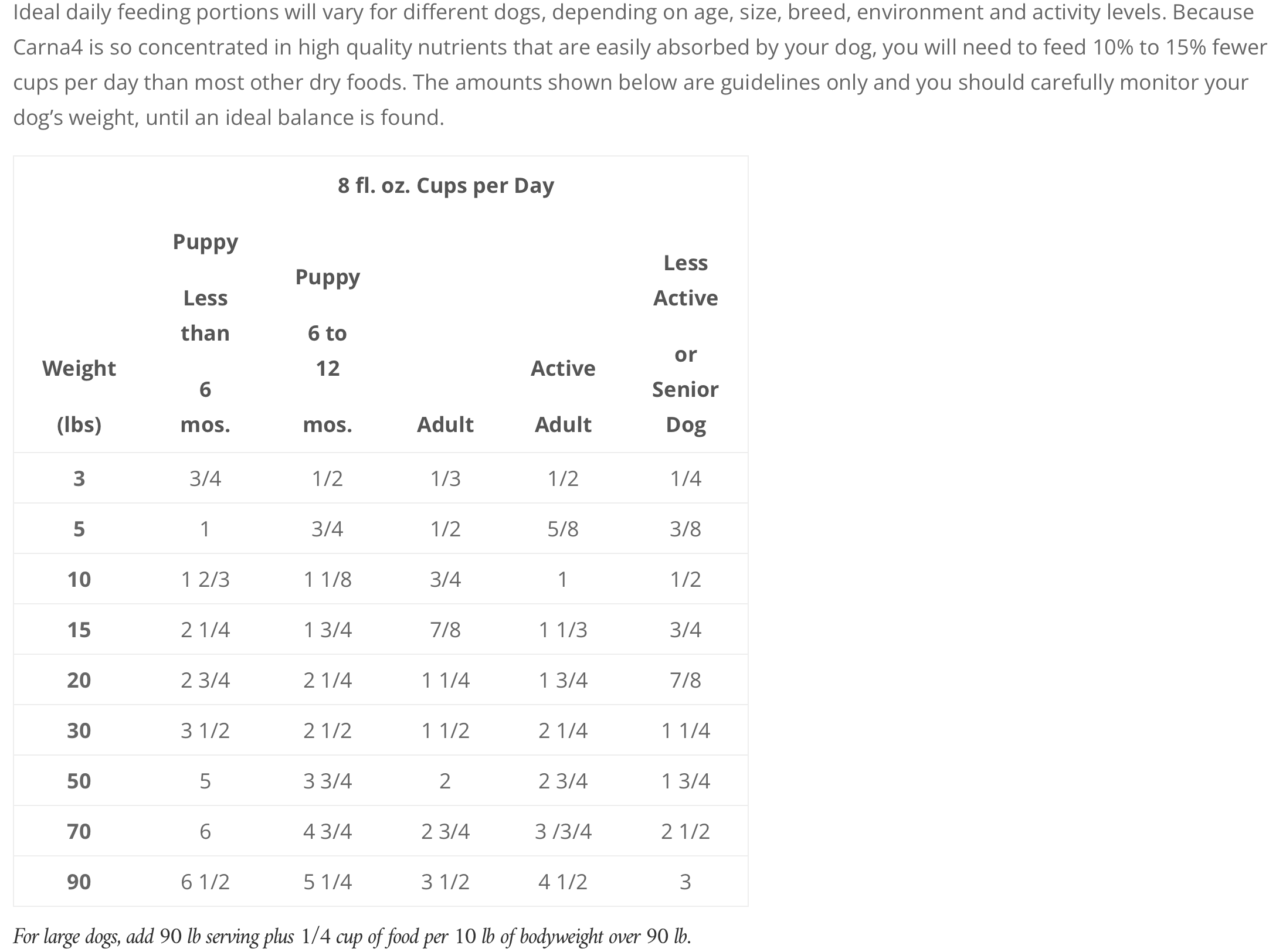 For example, just two and a quarter 8 fl.oz cups of Carna4's Venison Recipe is 906 calories. Because of its superior digestibility, this is generally enough food for a 50 pound dog for an entire day. In comparison, two and a quarter 8 fl.oz cups of Hill's Science Diet Adult Chicken and Barley Recipe is 821 calories and the guideline on the bag tells you to feed 3 and 1/3rds of a cup per day to a 50 pound dog. This means that when comparing feeding guidelines, you would be feeding 32% less of Carna4's Venison Recipe compared to Hill's Science Diet Adult Chicken and Barley Recipe.