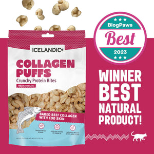 Looking for the ultimate combination of a healthy cat treat that packs a flavor punch? Collagen puffs are the perfect mini protein treat your furry best friend is sure to love. With just two ingredients, USA beef collagen and wild-caught cod skin, our puff treats are a crunchy, nutritious reward cats crave.