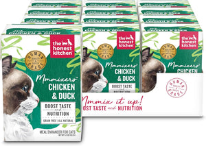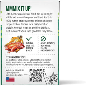 Mmmix it up! Cats may be creatures of habit, but we all enjoy a little extra something now and then! Add this 100% human grade, cage free chicken and duck topper to any meal or serve as a treat. No meat meals or anything artificial. Just a boost of indulgent protein they’ll love.