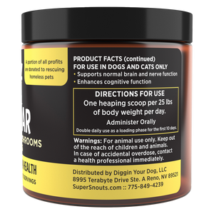 As your beloved pet ages, they may experience cognitive challenges. But with Super Snouts Lion’s Roar Powder Brain & Nervous System Supplement for Dogs & Cats, you can support their mental clarity, focus, and memory. This supplement is specially formulated for older cats and dogs. The thoughtful formula contains medicinal mushrooms to help reduce oxidative stress and promote a healthy nervous system. Made in the USA, Lion’s Roar also works to bolster the immune system response and maintain a healthy gut. Help them stay sharp and healthy with daily support from Super Snouts.