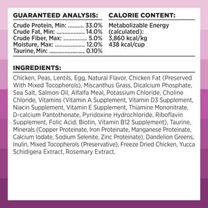 Chicken, Lentils, Whole Yellow Peas, Dried Yeast, Chicken Fat, Natural Flavor, Dried Egg Product, Ground Miscanthus Grass, Salmon Oil, Dicalcium Phosphate, Dehydrated Alfalfa Meal, Salt, Choline Chloride, Freeze-Dried Chicken, Vitamins (Vitamin E Supplement, Niacin Supplement, Thiamine Mononitrate, Vitamin A Supplement, Pyridoxine Hydrochloride, D-calcium Pantothenate, Riboflavin Supplement, Biotin, Vitamin B12 Supplement, Vitamin D3 Supplement, Folic Acid), Minerals (Zinc Proteinate, Iron Proteinate, Copper Proteinate, Manganese Proteinate, Sodium Selenite, Calcium Iodate), Inulin, Taurine, Mixed Tocopherols (a preservative), Yucca Schidigera Extract, Rosemary Extract