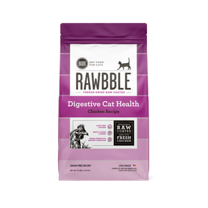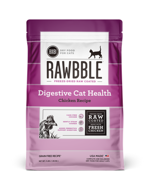For cats that thrive on a protein-rich diet, Rawbble Dry Food for Cats Digestive Health Chicken Recipe is made in the USA with cage-free chicken. With added benefits of prebiotics and fiber from miscanthus grass to support digestion, each meal offers the perfect balance of nutrients and is freeze-dried raw coated for purr-worthy flavor.