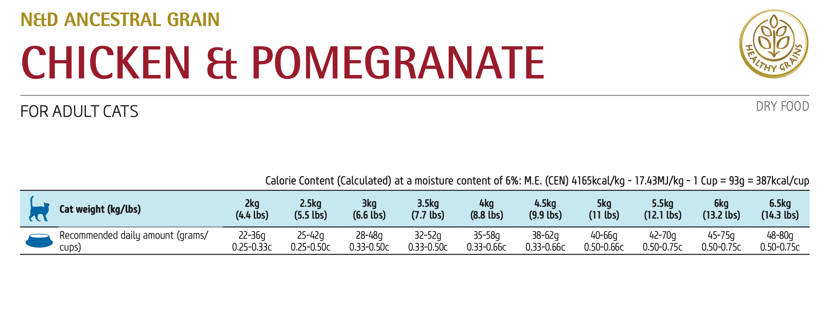 Limited ancestral cereals and lots of animal protein are sure-fire cat pleasers in Farmina N&D Ancestral Grain Chicken & Pomegranate Adult Cat Dry Food. Comprised of an outrageously yummy mix of animal ingredients – including boneless chicken – GMO-free ancestral cereals like whole spelt and oats, dried fruits and vegetables and essential vitamins and minerals, this delicious dish is made without corn or artificial preservatives. And because Farmina N&D Ancestral Grains products have been clinically tested through cruelty-free research to have a low glycemic index, you can be sure you’re feeding your lovely lady the diet she needs to help her stay strong.