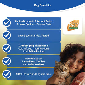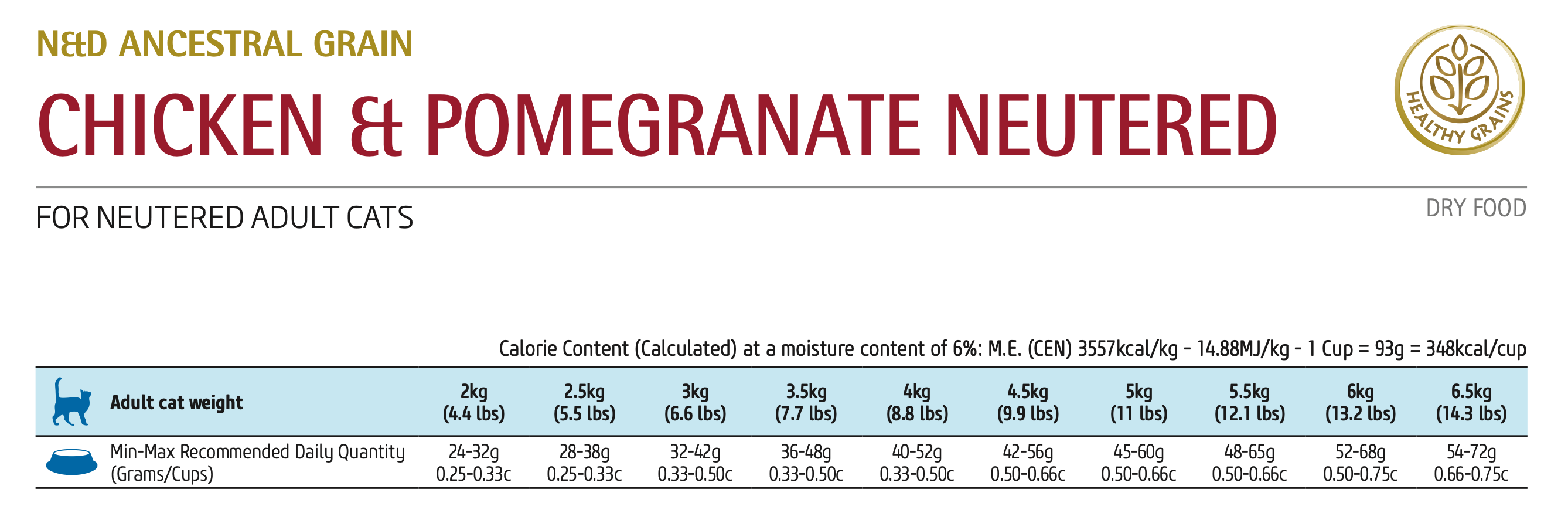 Farmina N&D Ancestral Grain Chicken & Pomegranate Neutered Cat Dry Food is the perfect meal for the pretty kitty with a taste for nutritious Italian fare. Comprised of an outrageously yummy mix of animal ingredients – including boneless chicken – GMO-free ancestral cereals, dried fruits and vegetables, and essential vitamins and minerals, this delicious dish is made without corn or artificial preservatives. And because Farmina N&D Ancestral Grains products have been clinically tested through cruelty-free research to have a low glycemic index, you can be sure you’re feeding your lovely lady the diet she needs to help her stay strong.