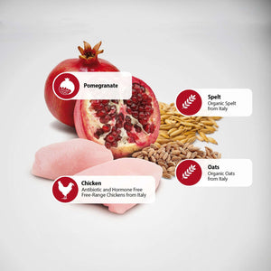 chicken, dehydrated chicken, whole spelt, whole oats, dried whole eggs, herring, dehydrated herring, dried beet pulp, chicken fat, herring oil, suncured alfalfa meal, dried carrot, inulin, fructooligosaccharide, yeast extract, dried pomegranate, dried apple, dried spinach, psyllium seed husk, dried sweet orange, dried blueberry, salt, brewers dried yeast, turmeric, vitamin A supplement, vitamin D3 supplement, vitamin E supplement, ascorbic acid, niacin, calcium pantothenate, riboflavin, pyridoxine hydrochloride, thiamine hydrochloride, biotin, folic acid, vitamin B12 supplement, choline chloride, beta-carotene, zinc methionine hydroxy analogue chelate, manganese methionine hydroxy analogue chelate, ferrous glycine, copper methionine hydroxy analogue chelate, DL-Methionine, taurine, L-Carnitine, aloe vera gel concentrate, green tea extract, rosemary extract, mixed tocopherols (a preservative).
