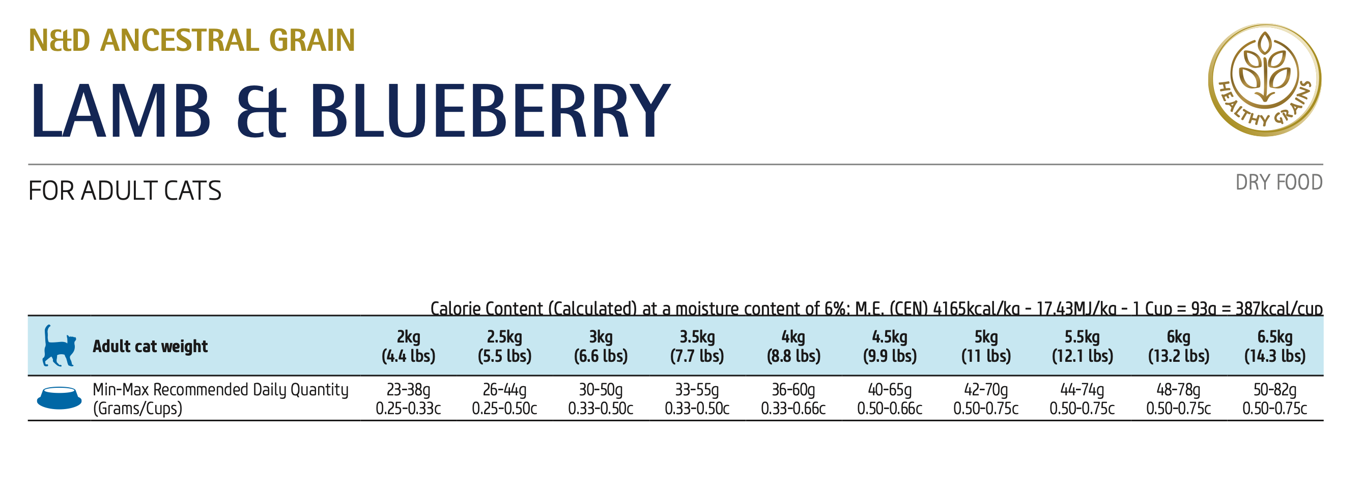 Limited ancestral cereals and lots of animal protein are sure-fire cat pleasers in Farmina N&D Ancestral Grain Lamb & Blueberry Adult Cat Dry Food. Comprised of an outrageously yummy mix of animal ingredients – including regionally sourced lamb – GMO-free ancestral cereals and choice dried fruits like blueberries and sweet oranges, this delicious dish is made without corn or artificial preservatives. And because Farmina N&D Ancestral Grains products have been clinically tested through cruelty-free research to have a low glycemic index, you can be sure you’re feeding your lovely lady the diet she needs to help her stay strong.