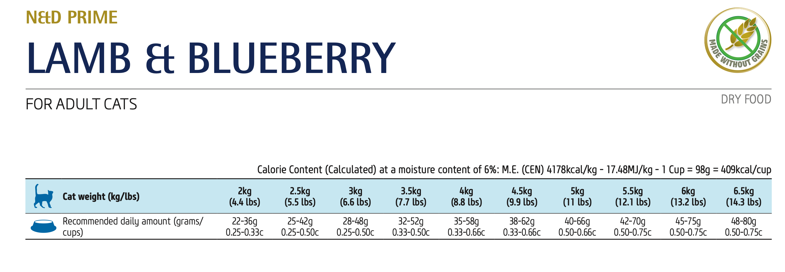 Serve your furry family member a mouthful of goodness with Farmina N&D Prime Cat Lamb & Blueberry Adult Cat Dry Food. Comprised of a delicious mix of animal ingredients – including regionally sourced lamb – choice dried fruits like blueberries and sweet oranges, and essential vitamins and minerals, this classy dish is made without grains or artificial preservatives and has less than 3% fiber. And because Farmina N&D Prime products have been clinically tested through cruelty-free research to have a low glycemic index, you can be sure you’re feeding your little lady the diet she needs to help her stay strong. High in protein, low in carbs, packed in a protected environment, and served with love, this prime plate will delight your favorite feline with every bite