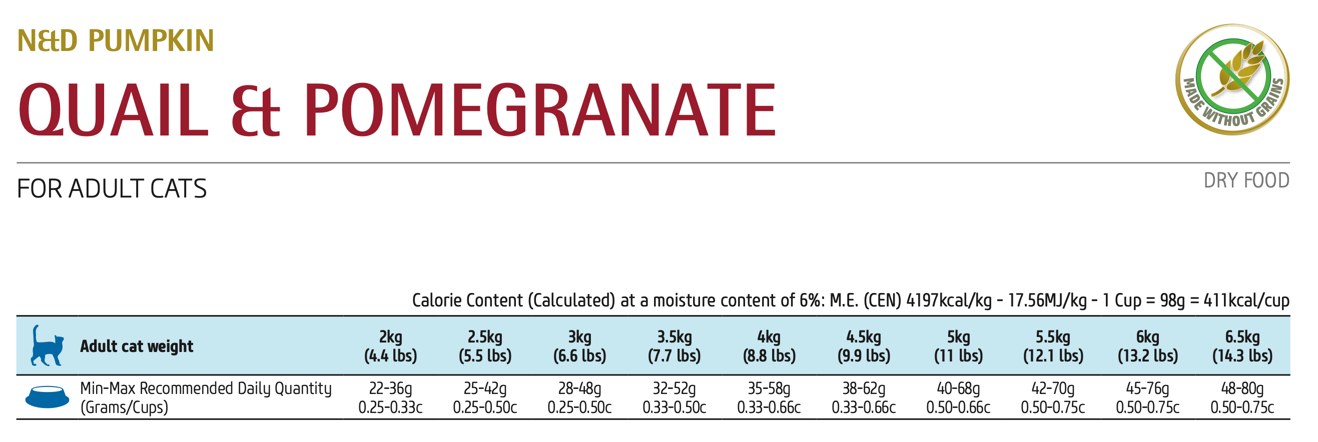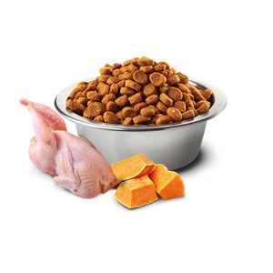 quail, dehydrated quail, pea starch, chicken fat, dried pumpkin, dried whole eggs, herring, dehydrated herring, herring oil, dried carrot, suncured alfalfa meal, inulin, fructooligosaccharide, yeast extract, dried pomegranate, dried apple, dried spinach, psyllium seed husk, dried sweet orange, dried blueberry, salt, brewers dried yeast, turmeric, vitamin A supplement, vitamin D3 supplement, vitamin E supplement, ascorbic acid, niacin, calcium pantothenate, riboflavin, pyridoxine hydrochloride, thiamine hydrochloride, biotin, folic acid, vitamin B12 supplement, choline chloride, beta-carotene, zinc methionine hydroxy analogue chelate, manganese methionine hydroxy analogue chelate, ferrous glycine, copper methionine hydroxy analogue chelate, DL-Methionine, taurine, L-Carnitine, aloe vera gel concentrate, green tea extract, rosemary extract, mixed tocopherols (a preservative).