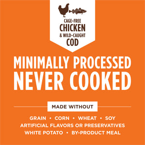 Chicken (including Ground Chicken Bone), Chicken Liver, Pumpkinseeds, Chicken Heart, Cod, Ground Flaxseed, Beet Juice (color), Salmon Oil, Ground Chia Seed, Cranberries, Dried Kelp, Mixed Tocopherols (for freshness), Rosemary Extract.