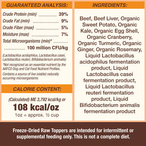 Beef, Beef Liver, Organic Sweet Potato, Organic Kale, Organic Egg Shell, Organic Cranberry, Organic Turmeric, Organic Ginger, Organic Rosemary, Liquid Lactobacillus acidophilus fermentation product, Liquid Lactobacillus casei fermentation product, Liquid Lactobacillus reuteri fermentation product, Liquid Bifidobacterium animalis fermentation product