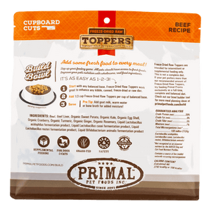 Add a boost of biologically appropriate raw nutrition to your pet’s diet. Primal’s Beef Recipe Cupboard Cuts Freeze-Dried Raw Topper for cat and dog food is made with grass-fed beef and beef liver raised without steroids or added hormones to nourish your pet with superior levels of amino and essential fatty acids. It also features certified organic fruits and vegetables for antioxidants and phytonutrients, plus probiotics for safety. It’s shelf-stable and available in 3.5- and 18-ounce resealable bags.