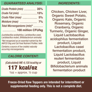 Chicken, Chicken Liver, Organic Sweet Potato, Organic Kale, Organic Rosemary, Organic Cranberry, Organic Turmeric, Organic Ginger, Liquid Lactobacillus acidophilus fermentation product, Liquid Lactobacillus casei fermentation product, Liquid Lactobacillus reuteri fermentation product, Liquid Bifidobacterium animalis fermentation product