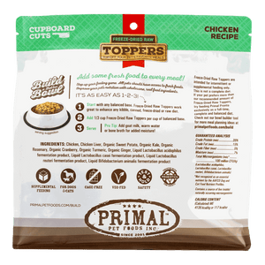 Add a boost of biologically appropriate raw nutrition to your pet’s diet. Primal’s Chicken Recipe Cupboard Cuts Freeze-Dried Raw Topper for cat and dog food is made with cage-free chicken and chicken liver raised without antibiotics, steroids, or added hormones to nourish your pet with superior levels of amino and essential fatty acids. It also features certified organic produce for antioxidants and phytonutrients, plus probiotics for safety. It’s shelf-stable and available in 3.5- and 18-ounce resealable bags.