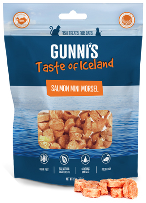 Our Salmon Mini Morsels are super tasty super premium cat treats made from a mix of salmon, cod and haddock filets. Treat your cat with our "Taste of Iceland" experience, they will love it!