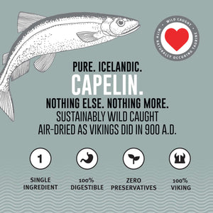 Your cat will love the irresistible taste, and satisfying crunch of our nutritious and natural Capelin Whole Fish & Pieces cat treats, made from one single ingredient — Capelin! They are caught fresh in the cold, pure waters of Iceland, and air-dried within FDA, USDA, EU, and MAST standards. Our 100% edible and digestible Capelin treats promote healthy skin and coat with Omega-3 fatty acids. They also reduce plaque and tartar build-up, making them good for your cat’s teeth. Plus, since these treats feature a single protein source, they’re a smart choice for cats with food sensitivities.