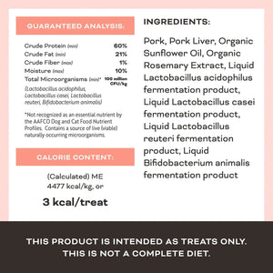 Pork, Pork Liver, Organic Sunflower Oil, Organic Rosemary Extract, Liquid Lactobacillus acidophilus fermentation product, Liquid Lactobacillus casei fermentation product, Liquid Lactobacillus reuteri fermentation product, Liquid Bifidobacterium animalis fermentation product