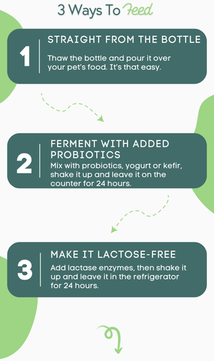 Mix into your dog’s or cat’s meal — cooked, fresh or anything in between. Keep refrigerated. Shake well before use. Best if used within 10 days of thawing.