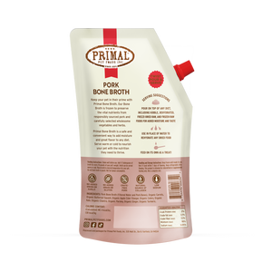 Add vital hydration to your dog or cat’s diet with our Pork Bone Broth. Just pour over your pet’s favorite frozen or freeze-dried raw recipe, kibble, or wet food to add beneficial nutrients that support digestion and joint and liver health. Made from crate-free pork and features gelatin to support your pet’s intestines and help maintain a healthy gut. In addition, organic turmeric serves as a natural anti-inflammatory, antioxidant, and detoxifier. Available in an easy-to-pour 20-ounce resealable pouch.
