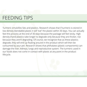 *Our turmeric is in a foil-lined package, not plastic. Turmeric emulsifies plastic over time, which means that after 30 days micro-particles of plastic will dissolve into your supplement and be consumed by your pet, potentially contributing to endocrine disorders and imbalances. Please do not transfer this product out of its original package and do not leave plastic spoons or serving utensils in the package.