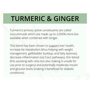 This blend has been shown to support liver health, increase fat metabolism (thus helping with weight management, gallbladder buildup, and fatty lipomas), decrease inflammation (via Cox2 pathways), thin blood (this assisting with clots but also making it unsafe for use prior to surgery) and potentially moderate insulin and glucose levels (making it beneficial for diabetic conditions).