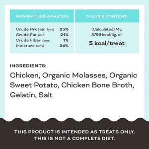 Chicken, Organic Molasses, Organic Sweet Potato, Chicken Bone Broth, Gelatin, Salt