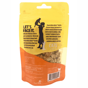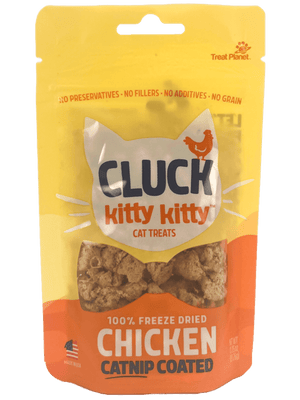 Chicken and catnip combine for a delicious and stimulating treat your finicky feline will love. Cluck Kitty Kitty Chicken Catnip Coated Freeze Dried Cat Treats are super healthy limited ingredient treats made with 100% freeze dried chicken and coated in kitty favorite catnip. Treats contain no preservatives, fillers, additives, or grains. Natural and healthy, these are eco-friendly pet treats from Treat Planet are made in the USA.