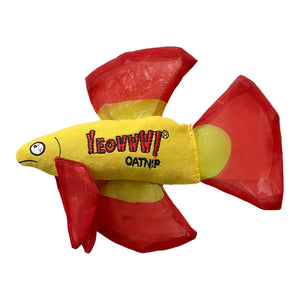 Calling all fans of fancy-finned, carefree freshwater fighting fish. Your cat’s playtime will scale new heights with these fun fish freshly stuffed with organically grown catnip. Made of a durable cotton twill body right here in the USA. Crinkle fabric adds a fun little crunch to the experience. From tip to tail, each betta fish is 6.5” long and comes in one of three colors: blue, purple or red. Relax, no tank needed!