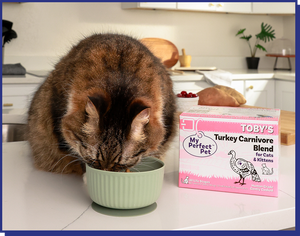 Toby’s Turkey Carnivore Blend is grain free and made with boneless skinless turkey thigh, plus a limited amount of fresh whole foods to meet all the nutritional needs for all life stages (adult cats, kittens, and gestating or lactating moms). Turkey is the #1 ingredient supplying 99% of the protein, and is rich in natural Taurine which is why you don’t see any synthetic Taurine supplements in our ingredients list.
